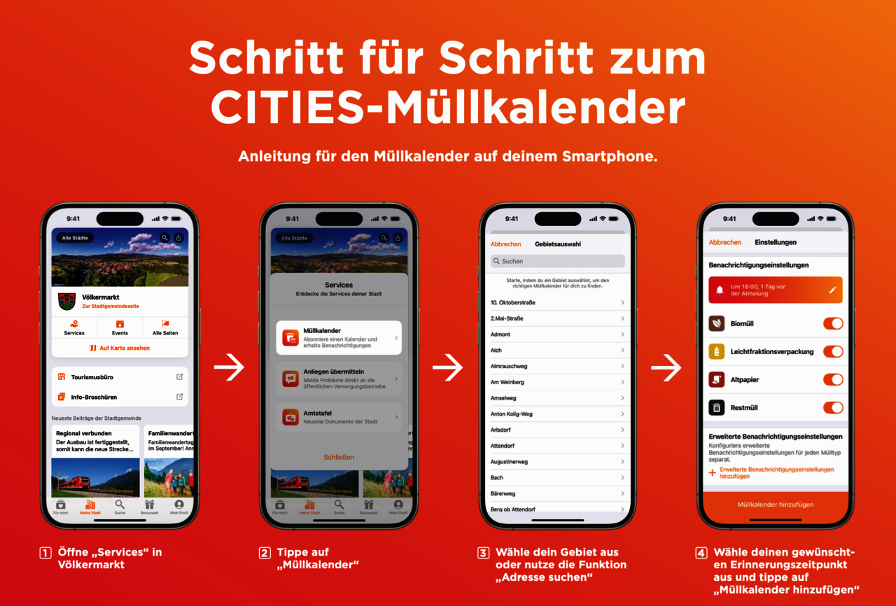 Die Gemeinde Völkermarkt nutzt seit Oktober 2022 die digitale Plattform CITIES, um Bürger:innen aktuelle Informationen und praktische Services bereitzustellen – darunter auch den Müllkalender. Die bisherige App wird eingestellt. Damit du weiterhin rechtzeitig an die Müllabfuhr erinnert wirst, folge einfach dieser Anleitung: