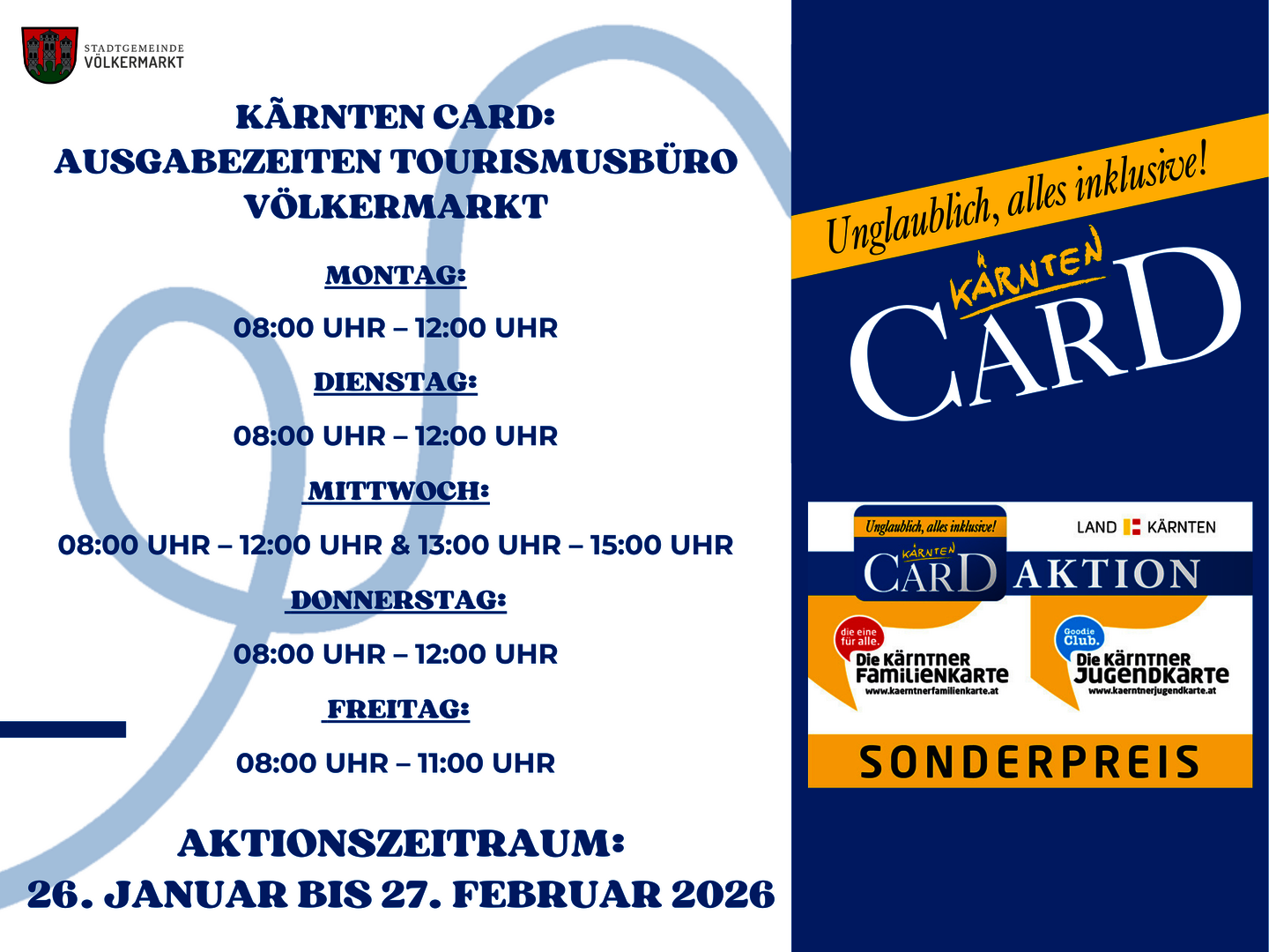 Die Aktion gilt von 26. Jänner bis 27. Februar 2026. Die ermäßigten Karten sind ausschließlich bei den offiziellen Ausgabe- und Aufladestellen der Kärnten Card erhältlich. Online ist die Aktion nicht gültig. Weitere Informationen finden Sie unter www.kaerntencard.at.